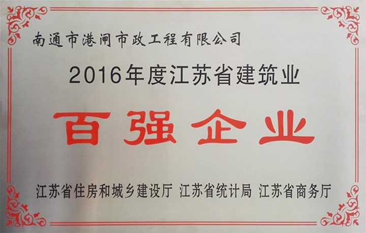 自2014年起,我公司連續三屆被江蘇省住建廳、商務廳、統計局認定為“江蘇省建筑業百強企業”(基礎設施類)。
